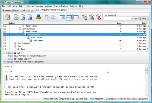 TLNews was a Usenet reader. Wikipedia defines Usenet as "a worldwide distributed discussion system [...] conceived in 1979". It allows people to subscribe to groups covering a wide range of topics and converse publicly.